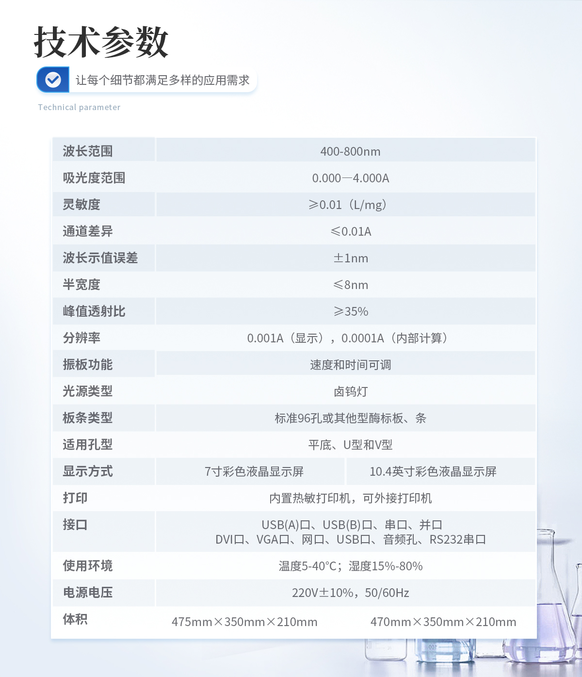 | 系統(tǒng):7英寸彩色觸摸屏,安卓系統(tǒng) | 讀數(shù)范圍 :0-4.000Abs | 濾光片帶寬:8~10nm | 分辨率:0.001Abs | 波長范圍:340-750nm覆蓋整個可見光波長 | 線性范圍:0~3.0Abs,士1%; 3~4.0Abs, 土2% (@405nm) | 準確性:士1% (0-3Abs) 士2% (3- 4Abs) (@405nm) | **性:CV≤0.2%(0-3Abs) CV≤1.0%(3- 4Abs)標準測量模式 (@405nm) | 濾光片:8片濾光片輪,標配4塊濾光片; 405nm,450nm,492nm,630nm,另可選; 配340nm-750nm波長濾光片 | 測量速度: (<6s, 96=""> | 內(nèi)存:可存儲200個測量程序和10萬個測結果(96孔板) | 接口:3個USB接口,分別用于連接電腦,打印機和U盤掃碼槍 | 光源:6V10W鹵素燈,壽命可達2000h | 外形尺寸:W440mm×D295mm×H225mm | 電源:AC100-240V, 50-60Hz, 2A | 凈重:10kg |